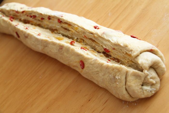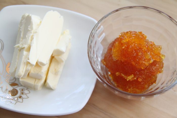 Тесто выложить на слегка присыпанный мукой стол, сформировать руками квадрат (у меня 40х40 см). Выложить начинку: масло и джем.