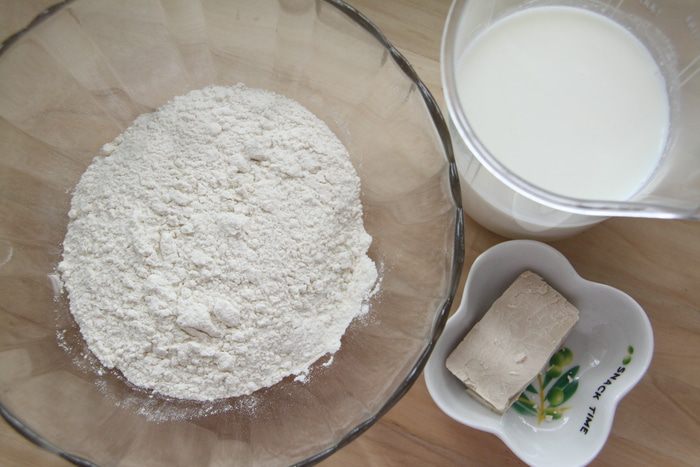 Муку для опары просеять. Соединить ингредиенты для опары: 100 г муки в/с, 13 г свежих дрожжей и 250 мл тёплого молока.