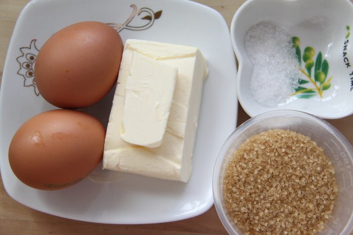 Яйца и масло заранее достать из холодильника, чтобы они были комнатной температуры. Отмерить сахар и соль (чайная ложка без горки).