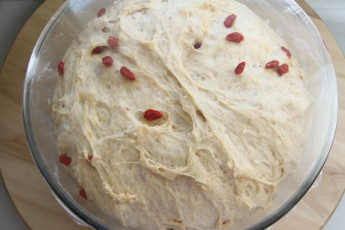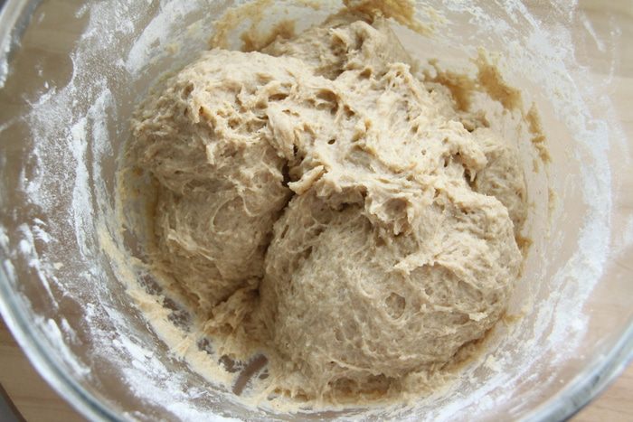 Замесить тесто. Оно получается довольно-таки липкое. Ёмкость закрыть пищевой плёнкой, оставить тесто на подъём на 1 час.