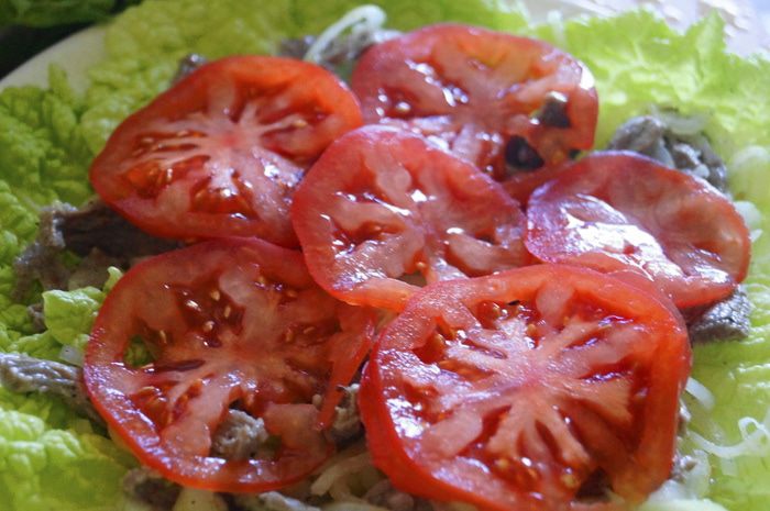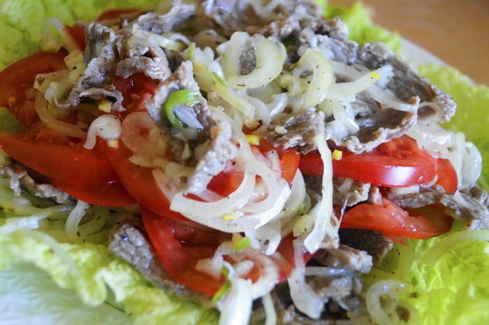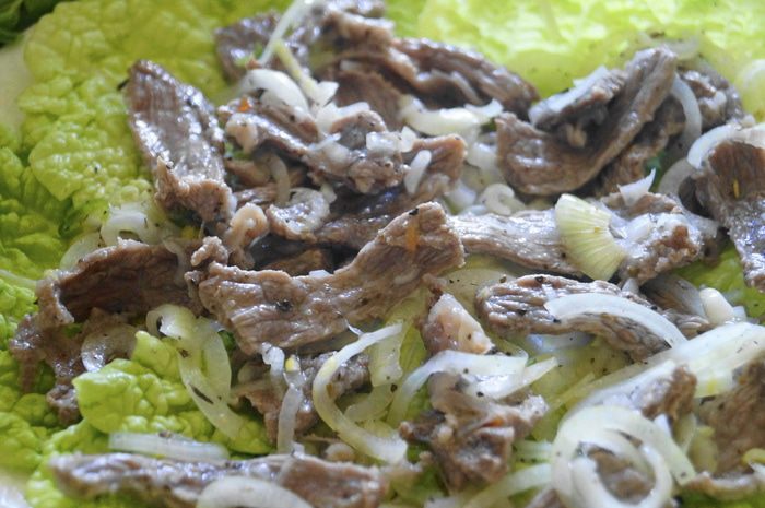 Перед самой подачей салата к столу: Выкладываем на блюдо листья пекинской капусты, либо зеленый салат, затем выкладываем слой мяса с луком.