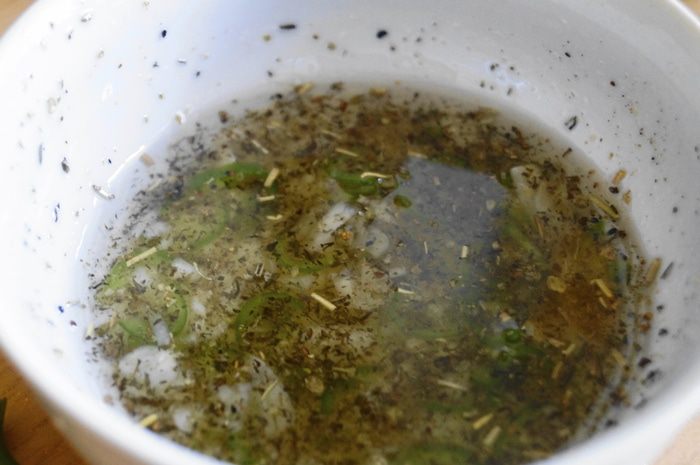 Для соуса: В оливковое масло добавляем нарезанный чеснок и перец чили. Затем сюда же добавляем сушеный базилик и бальзамический уксус. Вот где она острота.