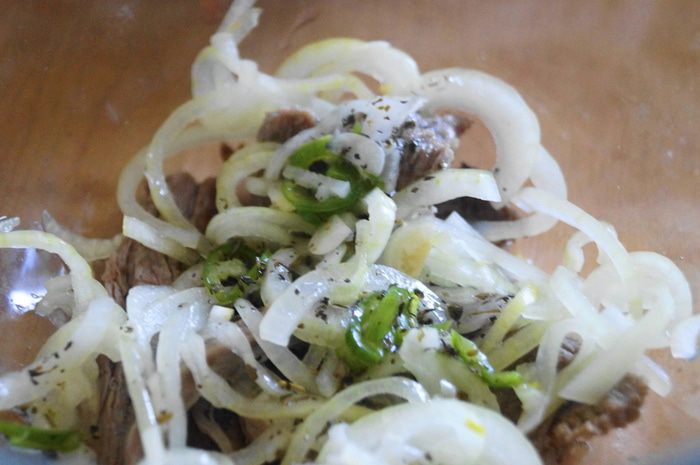 Теперь его необходимо замариновать. Для этого: лук разделить, сбрызнуть соком лимона, добавить сахар и соль. Пока отставить лук в сторону, мариноваться.