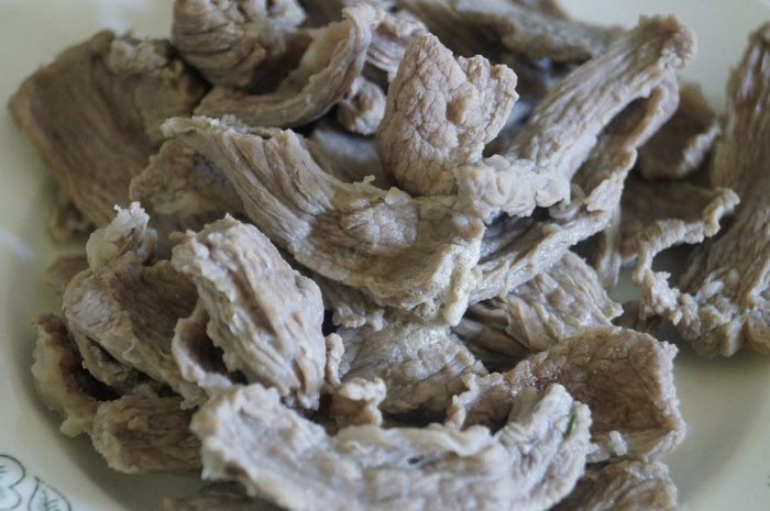 Мясо нарезать тоненькими слайсами.