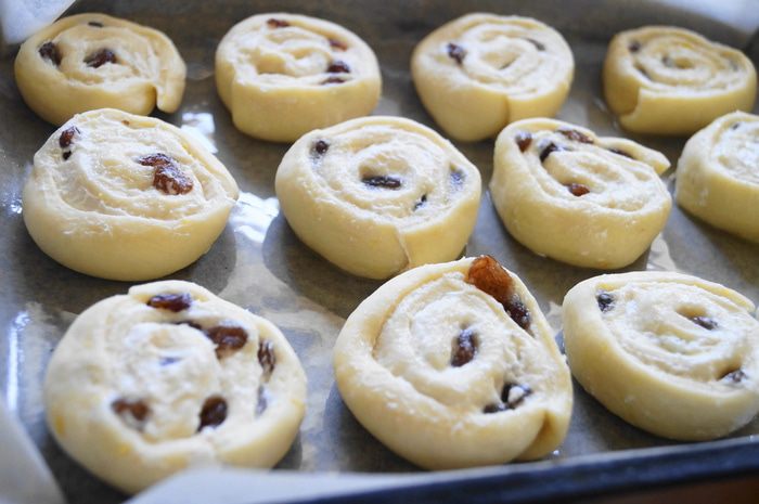 Булочки выложить на противень застеленный пергаментной бумагой и поставить выпекать в разогретую до 180 градусов духовку. Выпекать до зарумянивания.