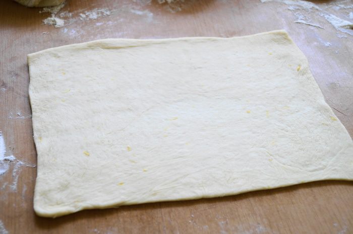 Готовое тесто разделить на 2-3 части, чтобы было удобнее раскатывать. Взять одну часть и раскатать в тонкий пласт.