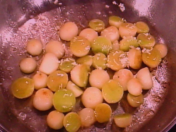 Выдавливаем сок лимона. Яблочки очищаем от кожицы и вырезаем шарики, которые сразу нужно сбрызнуть лимонным соком, чтобы они не потемнели. Для такой обработки яблока у меня есть специальная ложечка, если таковой нет, нарежьте яблоко на дольки. Таким же образом добываем шарики из дыни. Разогреваем сливочное масло, добавляем сахар, яблоки и слегка их карамелизируем. В конце приправляем натёртым хреном. Хрен можно использовать готовый.