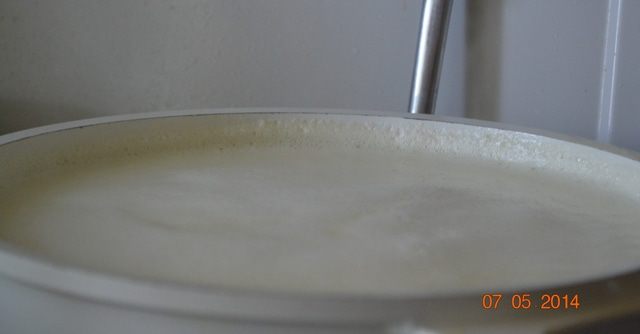 Когда молоко закипит,снимаем с огня, добавляем соду и лимонный сок. (К стати мама моя, кладет не лимонный сок, а лимонную кислоту разбавленной водой. Говорит, что так молоко не слишком темное получается).