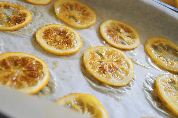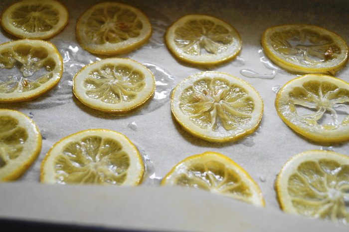 После этого: противень застелить пергаментной бумагой и выложить на него наши уваренные лимоны. Разогреть духовку до 90 градусов и поставить противень с лимонами в духовку. Сушить лимоны до коричневатого цвета, примерно, 1,5-2 часа.