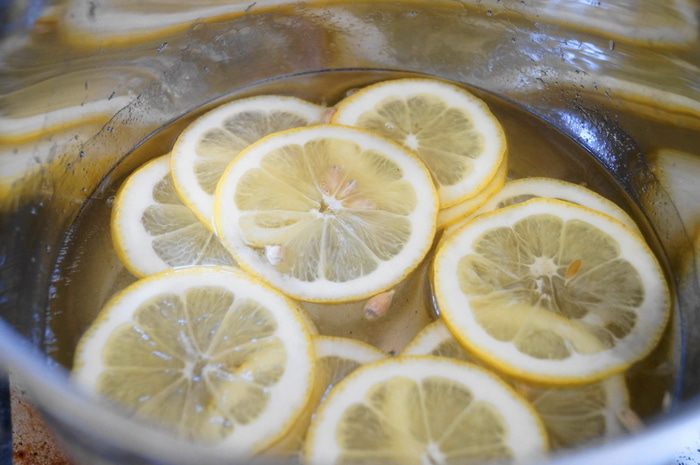 Погрузить ломтики лимона в горячий сироп и уваривать минут 25-30 до прозрачности лимонов. Сироп не должен кипеть, иначе останется одна кожура.