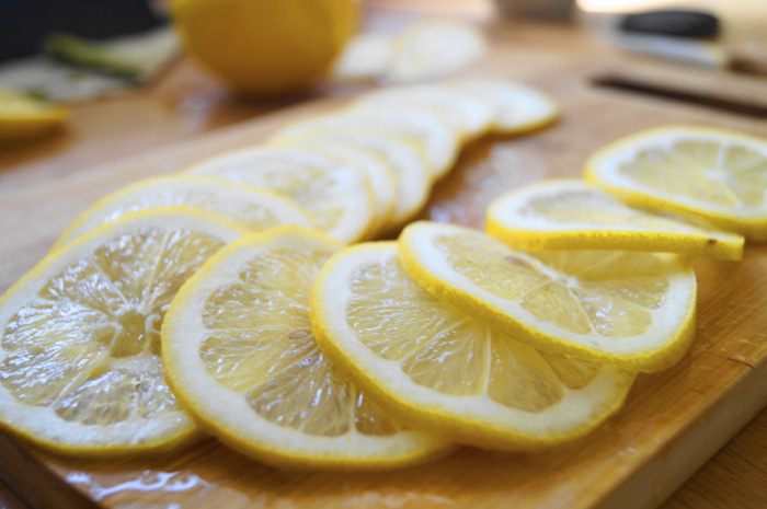 Лимончик хорошенько вымыть и насухо вытереть. Затем срезать верхушечки, они нам не понадобятся. Нарезать лимон тоненько, но не нарушив структуру дольки (т.е. без дырок в дольках).