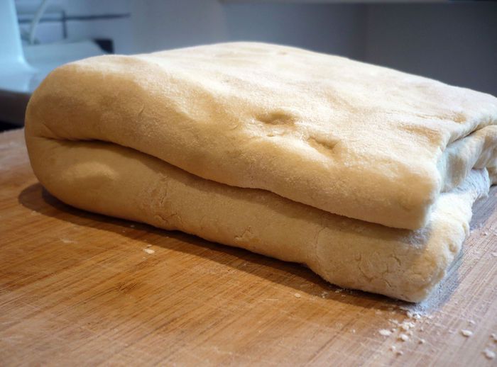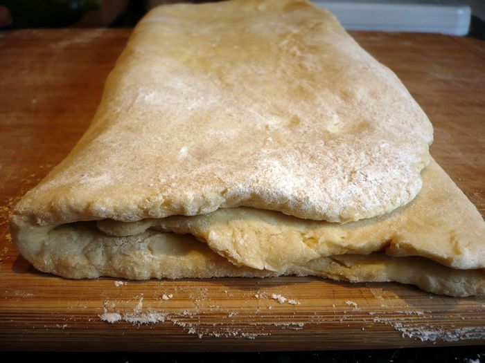 Теперь сворачиваем полученный пласт пополам. Заворачиваем тесто в пленку и убираем в морозилку на 16 — 18 минут. Достаем тесто из морозилки, раскатываем его на присыпанной мукой поверхности и повторяем ту же самую процедуру сворачивания, так называемый одинарный тур. Сворачиваем сложенное тесто пополам. Заворачиваем в пленку и убираем в морозилку снова на 16 — 18 минут.