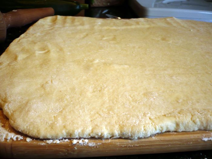 Выложим тесто на хорошо присыпанную мукой поверхность, тесто присыпем сверху также мукой и раскатаем в прямоугольный пласт примерно 35 на 25 см.