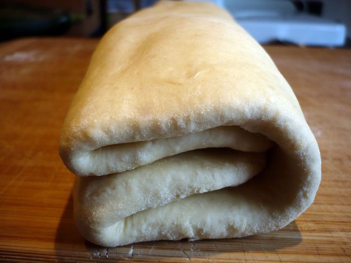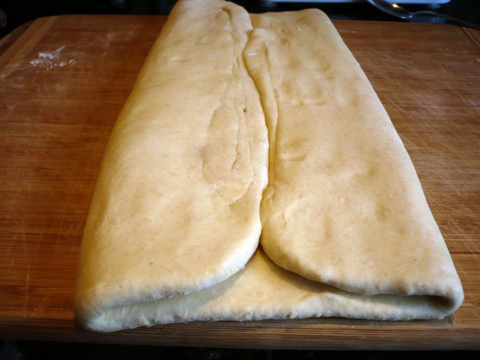 По удлиненной стороне пласта начинаем заворачивать тесто, зрительно поделив его на три равные части. Сначала с одной стороны, затем с другой так, чтобы левый край лег на правый.