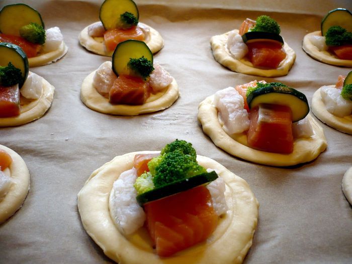 Солим цукини. На каждую тарталетку выкладываем по два кубика семги и красного окуня. Затем брокколи и кусочек цукини. Желток смешиваем с 1 ст.л. остывшего соуса. Смазываем им края тарталеток. Ставим тарталетки в духовку на 20 — 25 минут. Затем тарталетки скорее всего будут готовы, я оставила их еще минут на 20 в выключенной духовке, но это на ваше усмотрение.