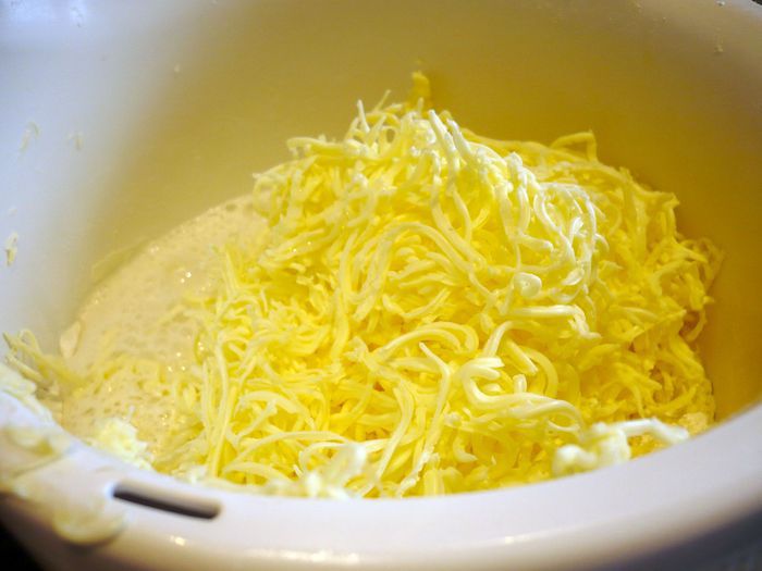 Начнем с теста. В муку добавим соль, перемешаем, натрем масло из холодильника, добавим ледяную воду, вымесим при помощи комбайна однородное тесто.