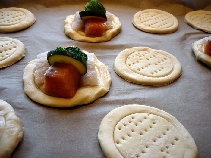 Рыбу снова промокаем полотенцем и солим со всех сторон. Режем рыбу небольшими кубиками. Тесто делим на 2 части. Каждую из которых раскатываем на присыпанной мукой поверхности в пласт. Вырезаем стаканчиком (8 или 9 см диаметром) круги, берем стаканчик поменьше и слегка вдавливаем в круги теста круги поменьше. Накалываем внутренние круги вилочкой.