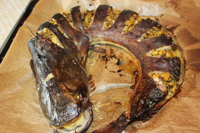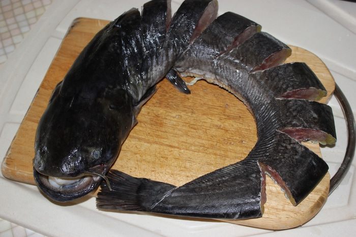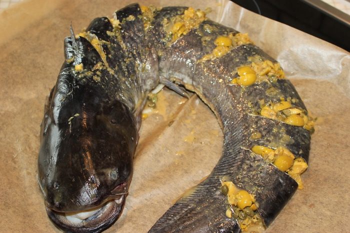 Рыбу очистить от внутренностей, хорошо промыть (жесткой губкой для посуды потрите кожу сома, чешуи у него нет, но слизь лучше смыть). Надрезать не до конца, чтобы получились кармашки для заправки.