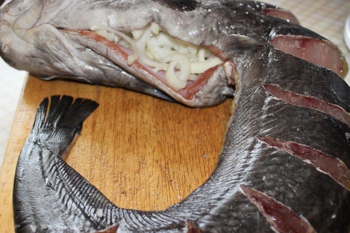 Натереть сома солью, и начинить брюшко луком.
