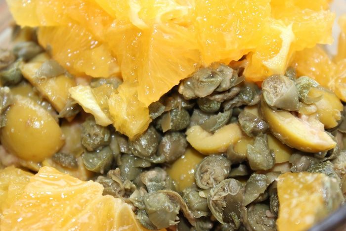 Для начала приготовим заправку. Апельсин очистить и порезать кубиком, добавить разрезанные оливки, каперсы и сушеный тимьян.