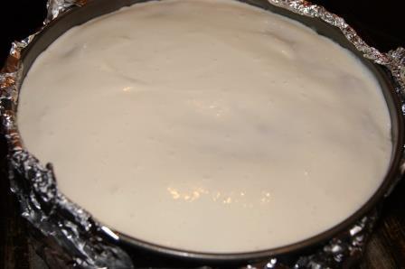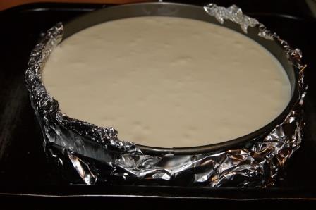 В форму положить основу, выложить крем, обвернуть форму фольгой. Форму поставить в большую форму наполненную на 3/4 водой. Выпекать при 170 гр. 45 минут.