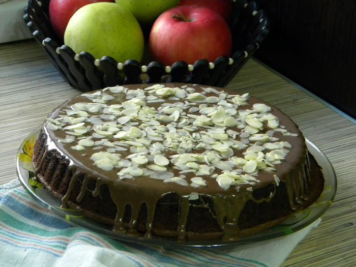 Перевернула брауни, смешала сгущенку с какао и полила сверху. Посыпала миндальными хлопьями.