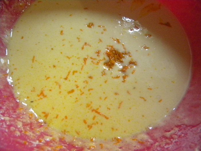 Взбиваем яйца с сахаром, потом муку с разрыхлителем, ваниль и цедру апельсина, перемешиваем хорошо.