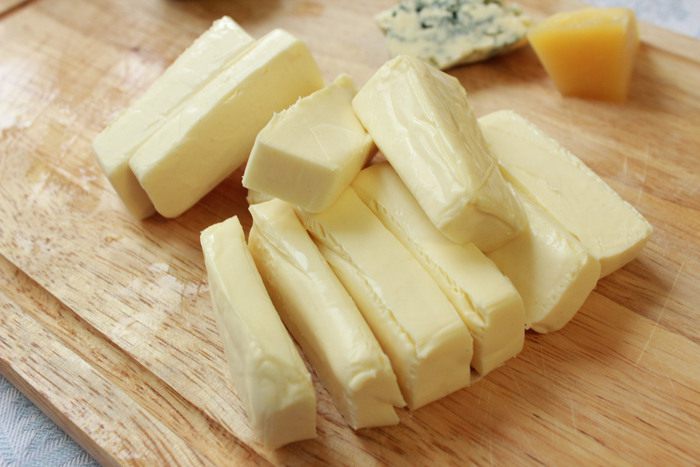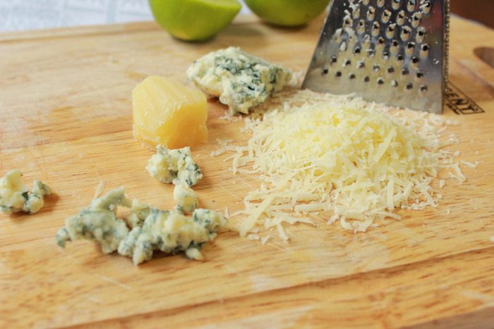 Пармезан натрите на мелкой терке. Сыр с голубой плесенью (на фото данаблю) измельчите.