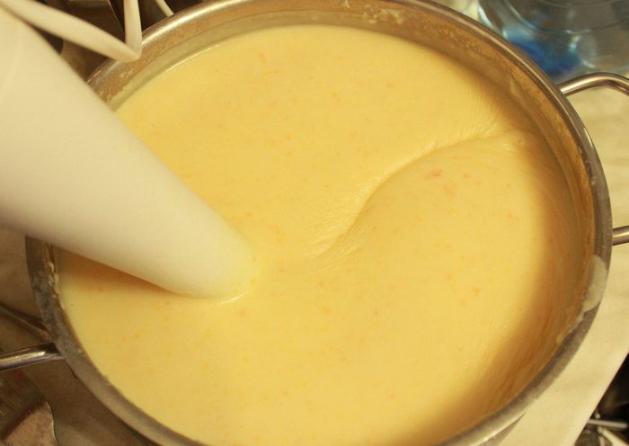 С помощью блендера приготовьте пюре из овощей с сырками и сливками.