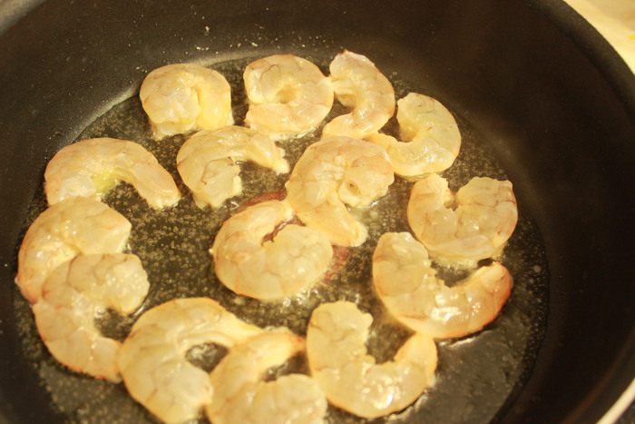 На сковороде разогрейте оливковое масло. Обжарьте в нем креветки с обеих сторон.