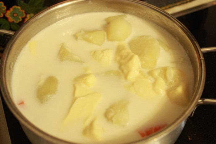 Когда овощи готовы, слейте лишнюю воду, если таковая есть. Добавьте сливки и положите в кастрюлю плавленые сырки. Доведите до кипения и на медленном огне поварите в течение 3-5 минут.