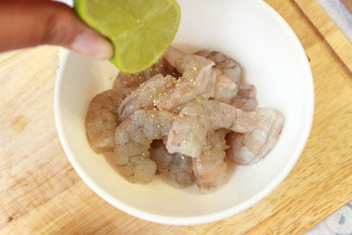 Креветки очистите от панциря и внутренностей. Выложите их в глубокую емкость. Приправьте солью, белым перцем и соком лайма. Оставьте мариноваться на 15-20 минут.