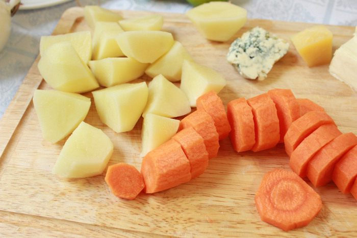 Морковь и картофель нужно почистить и нарезать. Положить в кастрюлю и варить до готовности. В процессе приготовления посолите и не забывайте снимать пену.