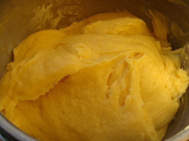 Можно вымешивать в комбайне. Тесто получается гладкое, пластичное и густое, но настолько, чтобы можно было выдавить из кулька.
