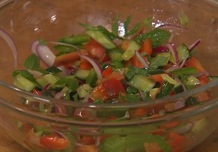 Нарезанные овощи выложить в салатницу, сбрызнуть оливковым маслом Extra Virgin, посолить, поперчить, посыпать мятой и перемешать.