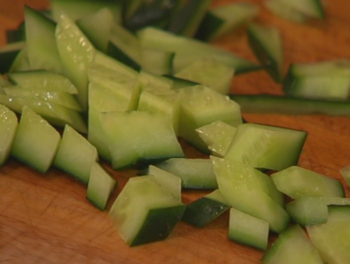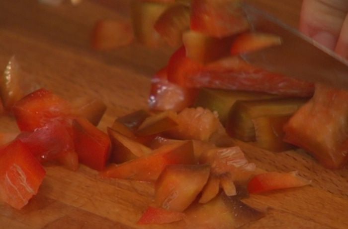 Сладкий перец, удалив плодоножки и семена, нарезать небольшими кусочками.
