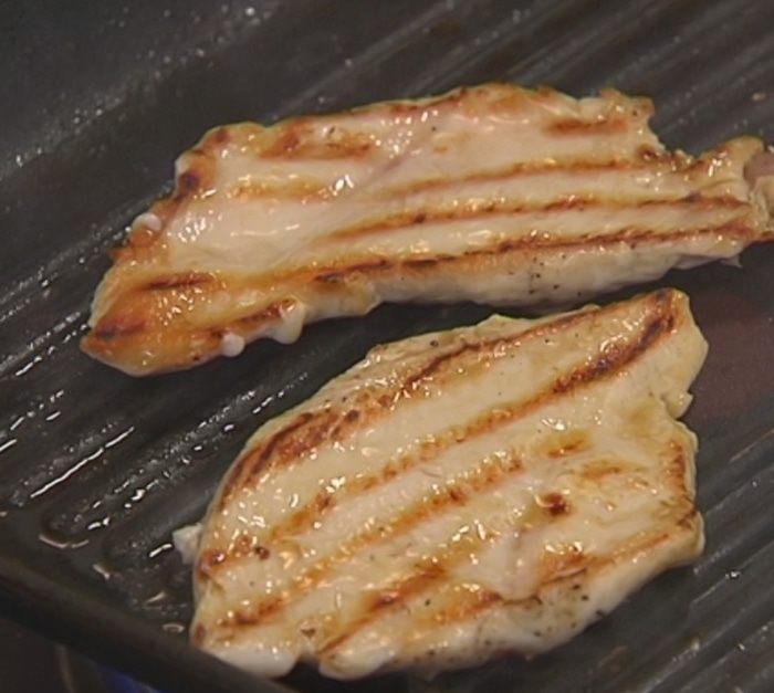 Разогреть в сковороде-гриль оливковое масло и обжарить грудку с двух сторон до готовности.