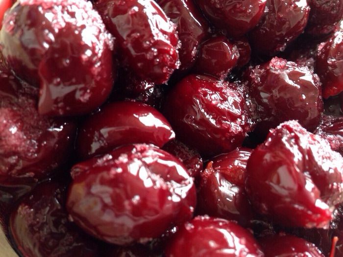 В сковородке растопить сливочное масло и добавить вишню с выделившимся соком.Томить на маленьком огне до почти полного выпаривания.