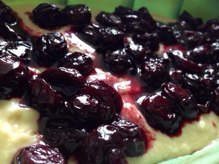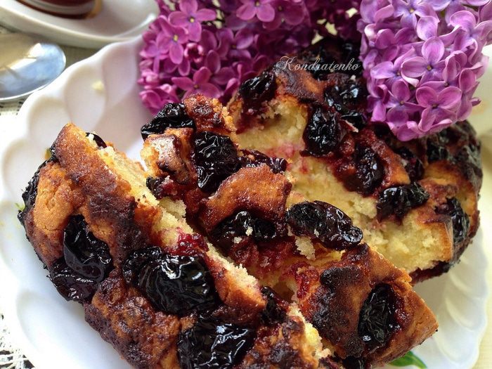 Выложить тесто в форму. Сверху выкладываем вишню и выпекаем 40-45 минут при температуре 180 градусов.