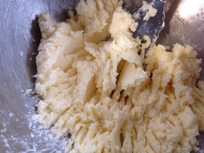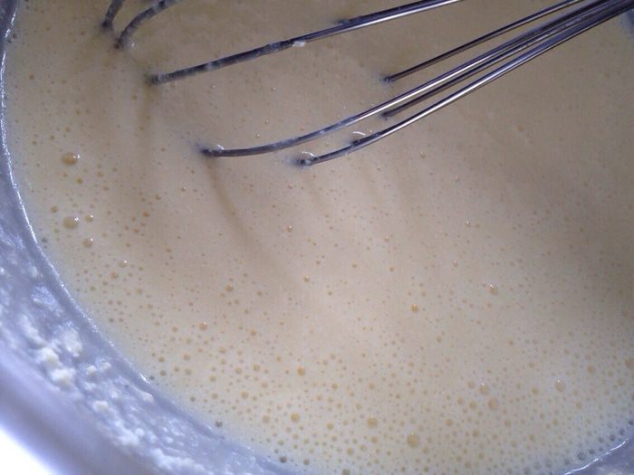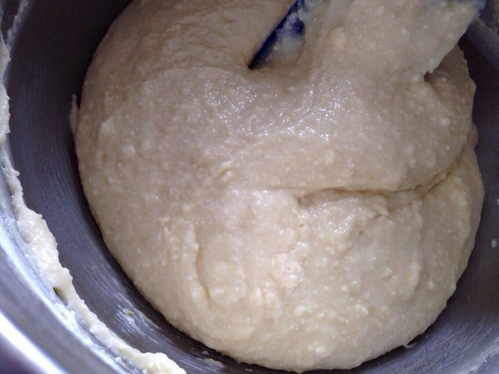 Просеять муку с разрыхлителем и, постепенно добавляя, замесить тесто (консистенция густой сметаны!).