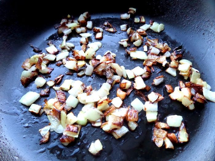 Обжарить лук до золотистого состояния.