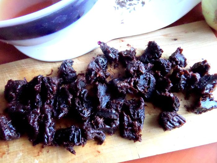 Чернослив отжать, нарезать на 3-4 части.