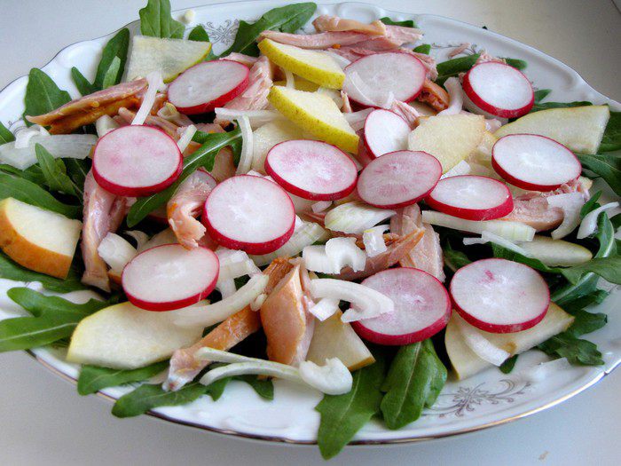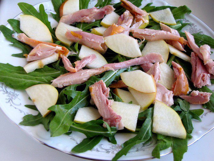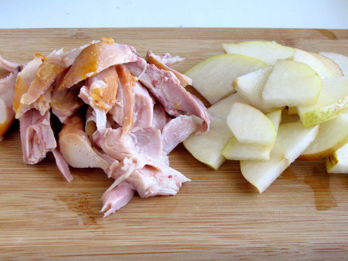 Грушу нарезать тонкими ломтиками и сбрызнуть лимонным соком, чтобы не потемнела. Вместо подкопченной утки, которая была в оригинальном рецепте, я использовала копченое мясо куриных бедер. Мясо нарезать не слишком мелкими кусочками.
