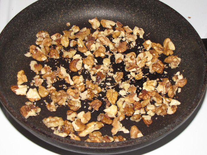 Грецкие орехи крупно порубить и обжарить на сухой сковороде.