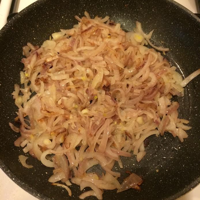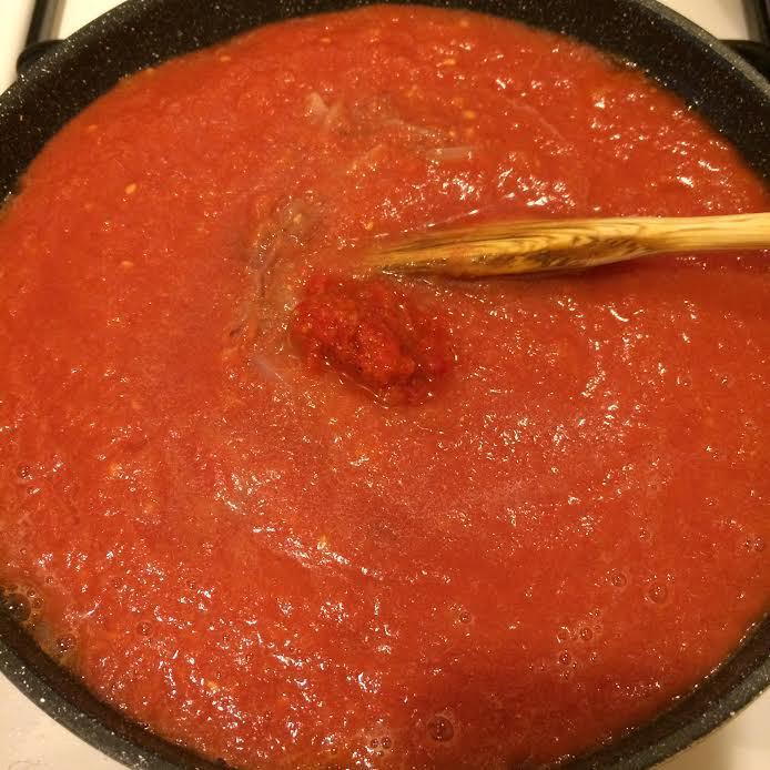 Помидоры пюрировать блендером. Добавить к луку помидоры, аджику, перемешать и тушить 3-4 минутки.