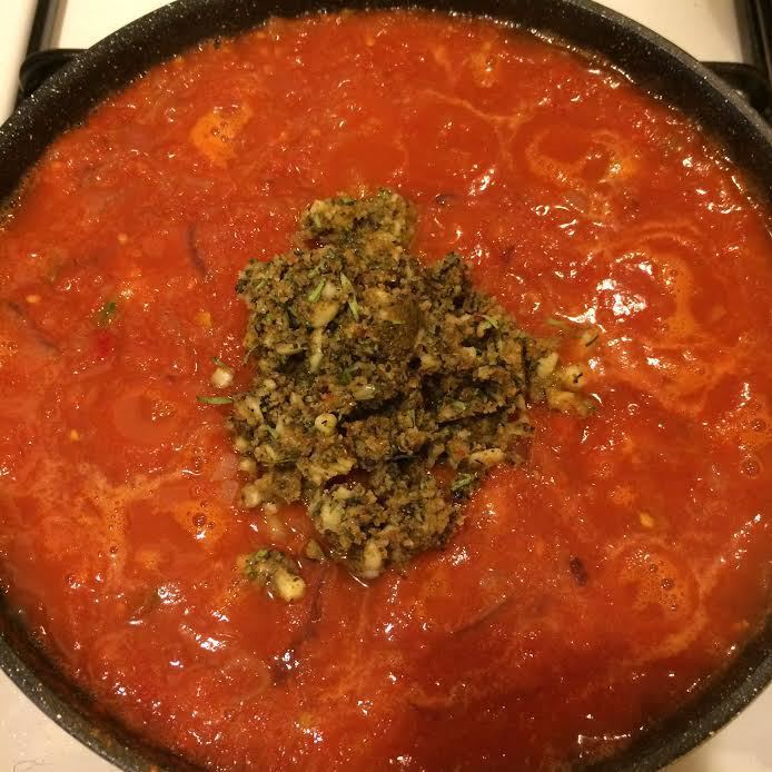 Добавить ореховую массу к помидорам, перемешать и тушить 2-3 минутки.