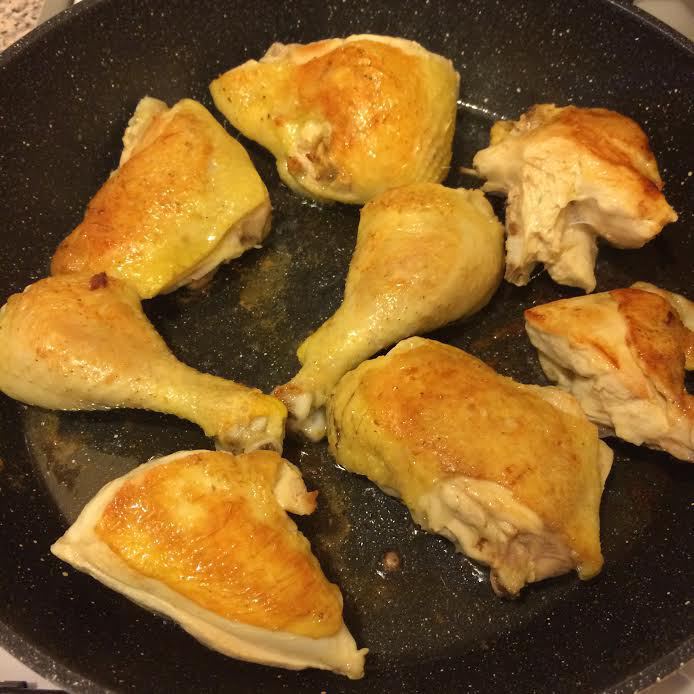 Курицу вымыть, обсушить бумажным полотенцем и обжарить на сковороде (без масла) до румяной корочки, затем налить немного кипятка, накрыть крышкой и жарить до готовности.