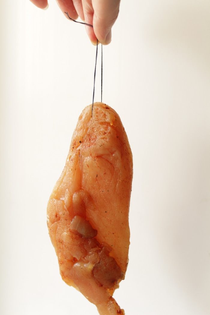 Но,я решила мясо еще немного подвялить, для это проденьте толстую нить и сделайте петлю. Мясо повесьте в проветриваемом помещении еще на 2-3 суток.