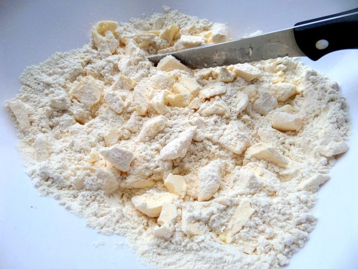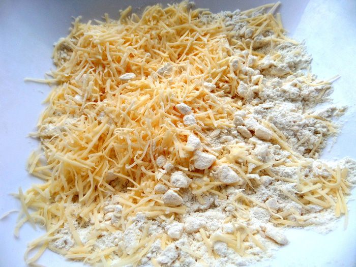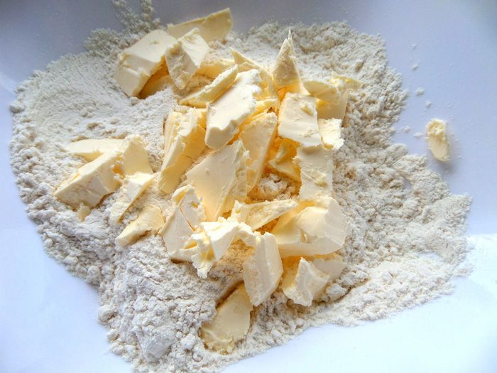 Высыпаем порциями в муку с маслом и перетираем рукой.
