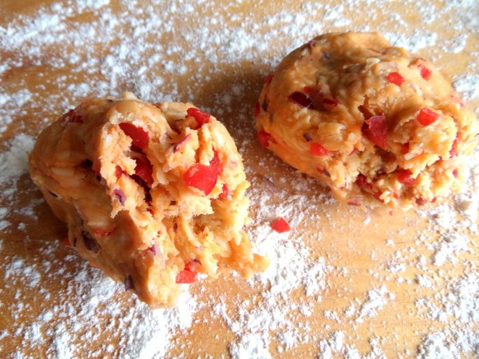 Мнём тесто руками...Вот тут мне и понадобилась дополнительная мука,из-за сока овощей,зато они придали яркий красивый цвет тесту!